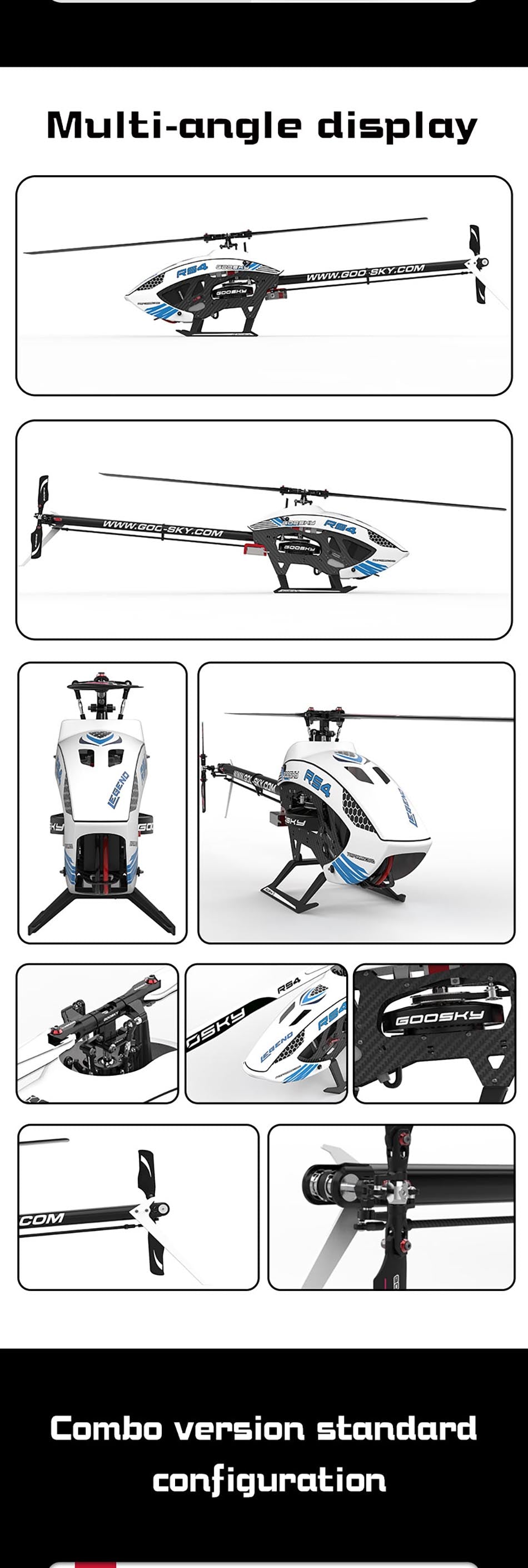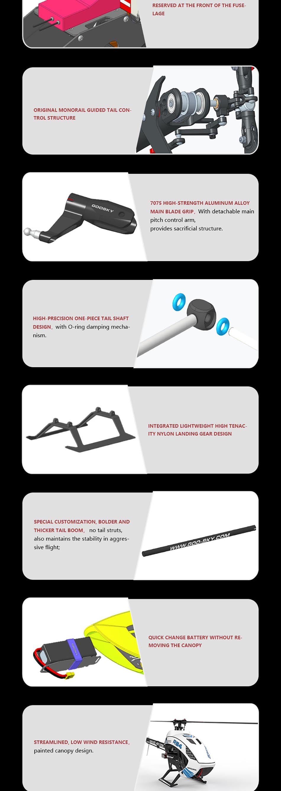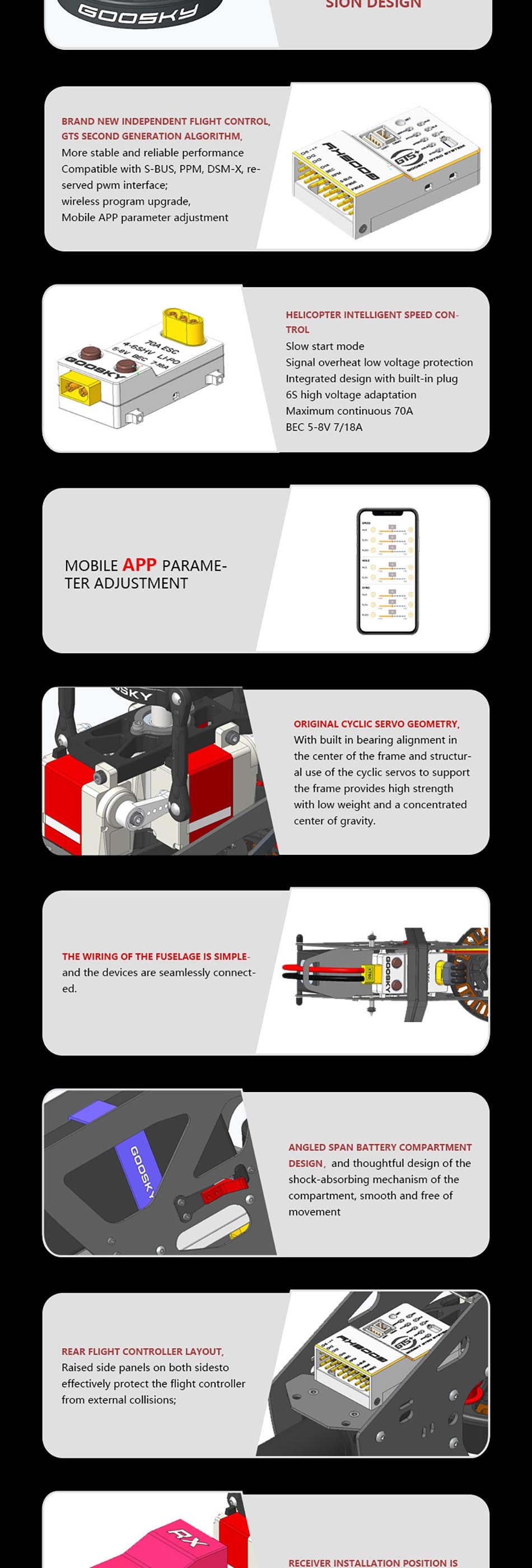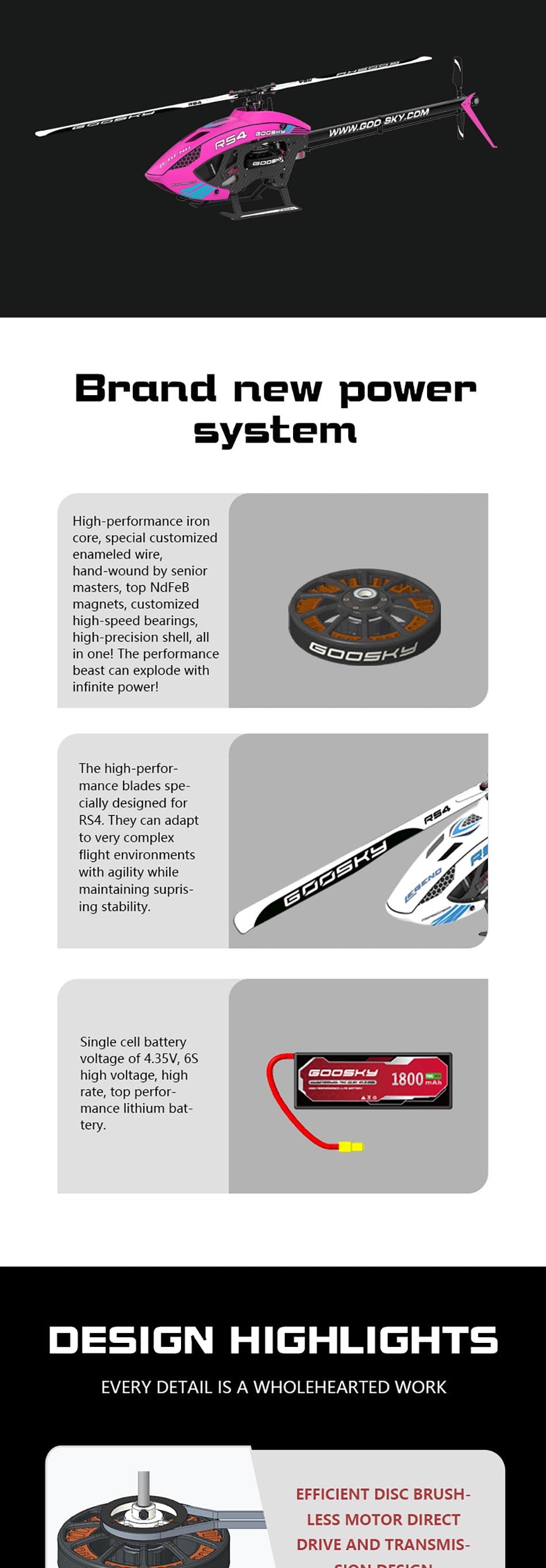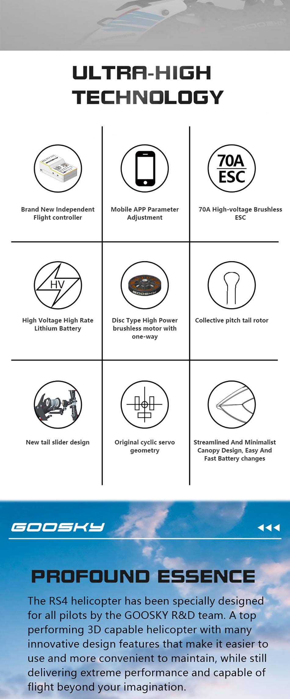 *The  GooSky RS4 Heli is a powerful 380 class RC Helicopter that features a high power direct drive main motor, belt driven tail rotor system, and is equipped with 390mm main blades.  GooSky RS4 direct drive main motor system removes the worry about stripped gears, and reduces overall parts count of the model. The belt driven tail rotor system is excellent for all pilots allowing for reliable performance and less worry about gears failing over time.