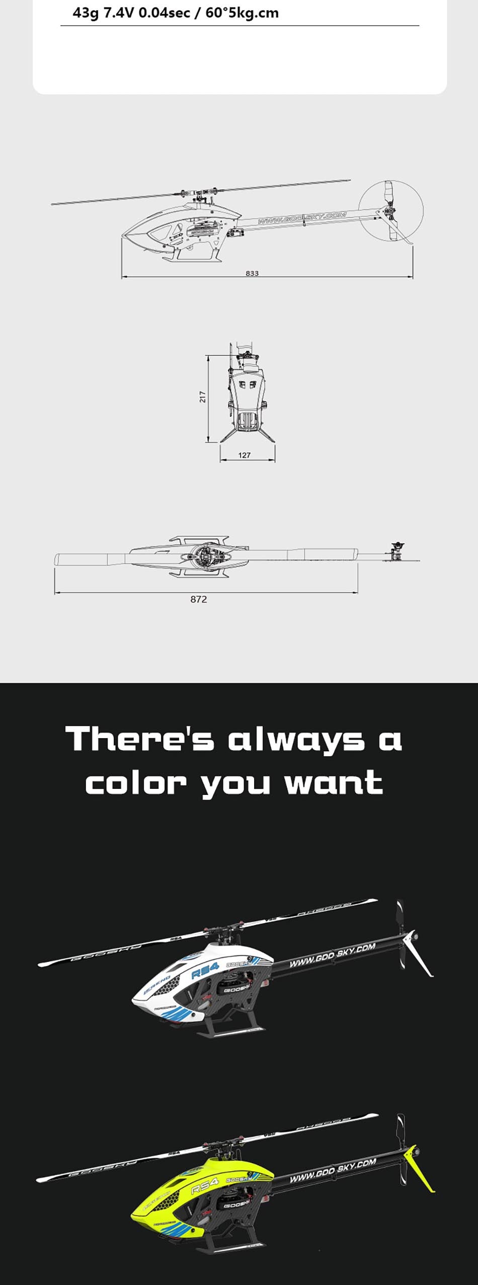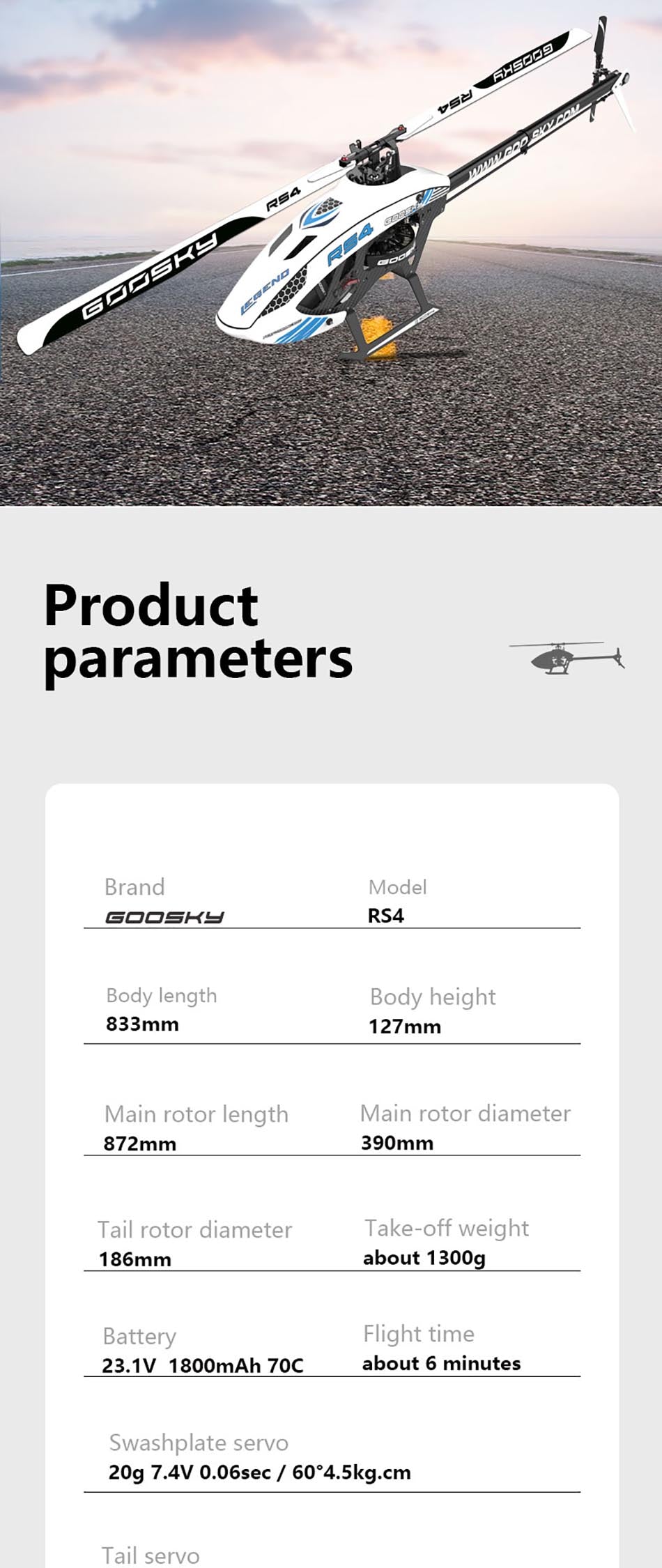 • GooSky RS4 Main Rotor Diameter: 34.3in (871.2mm)