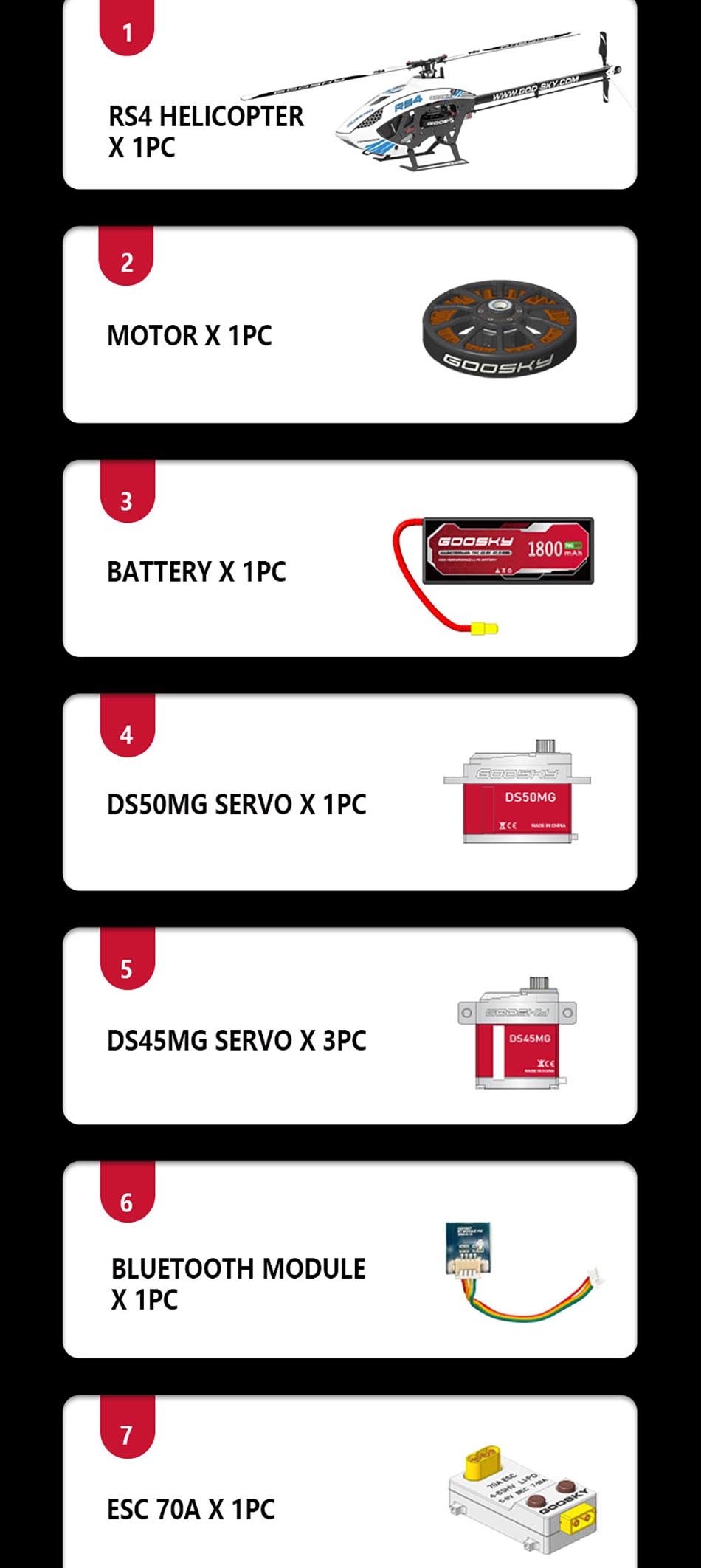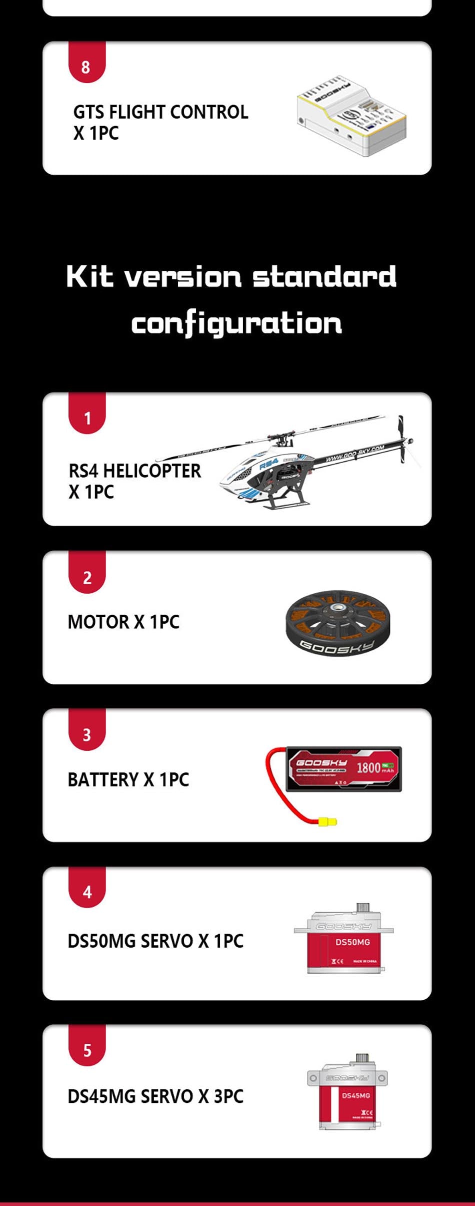 GooSky RS4 Kit Version (NO Receiver, No Transmitter, NO Bluetooth module, NO ESC, NO FBL Flight control ) includes: