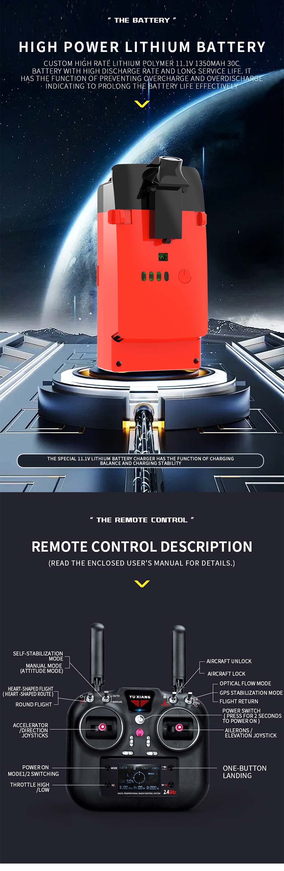 8> YXZNRC F09S use New 8-channel high-precision remote controller, 2.4GHZ two-way communication protocol. It has 1024 level operation feel high-definition display screen for two-way data retrieval, which can feed back important information such as aircraft power, flight speed, flight height, flight distance, flight direction and GPS quantity in real time, effectively improving users' accurate control of aircraft