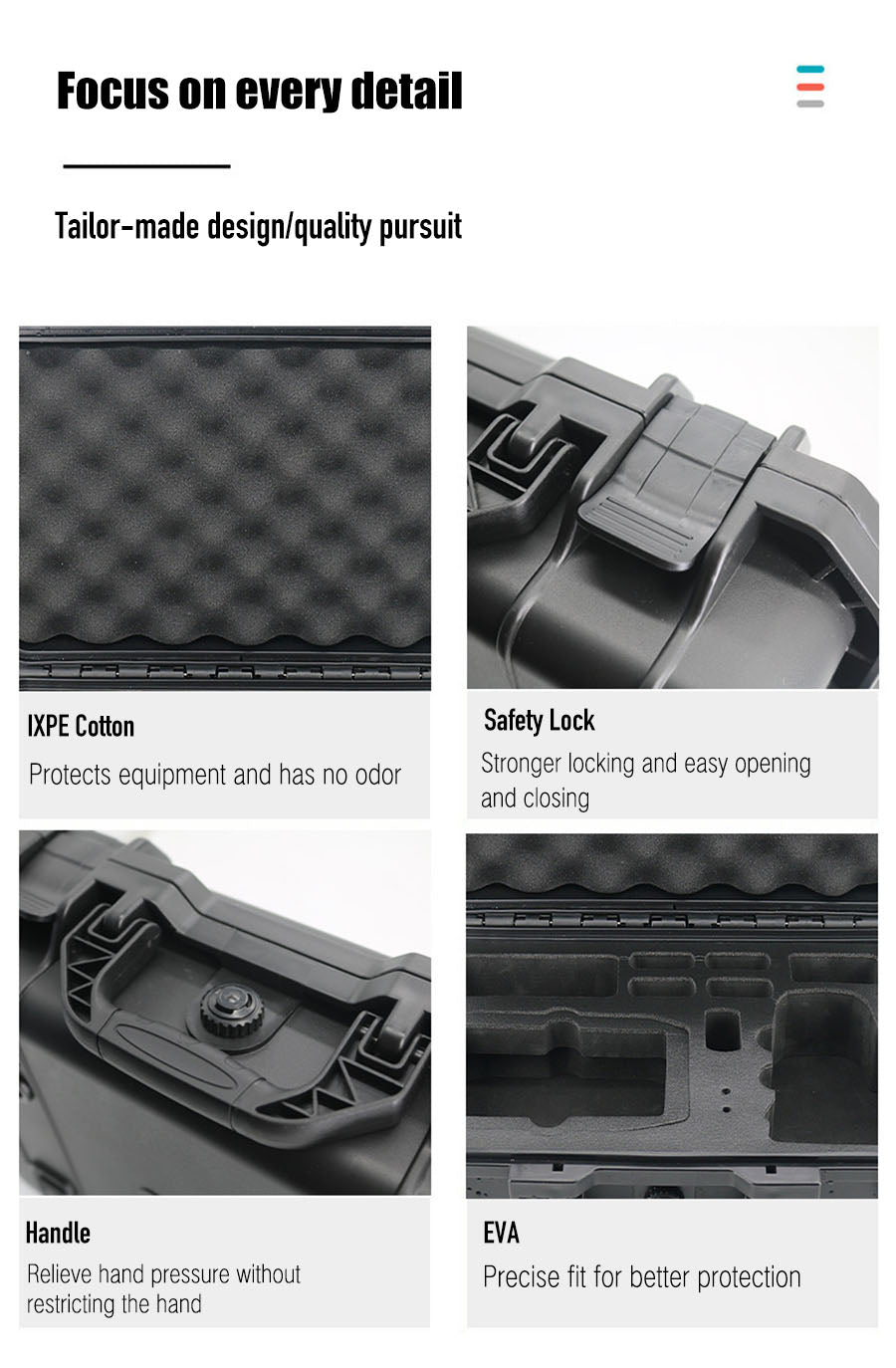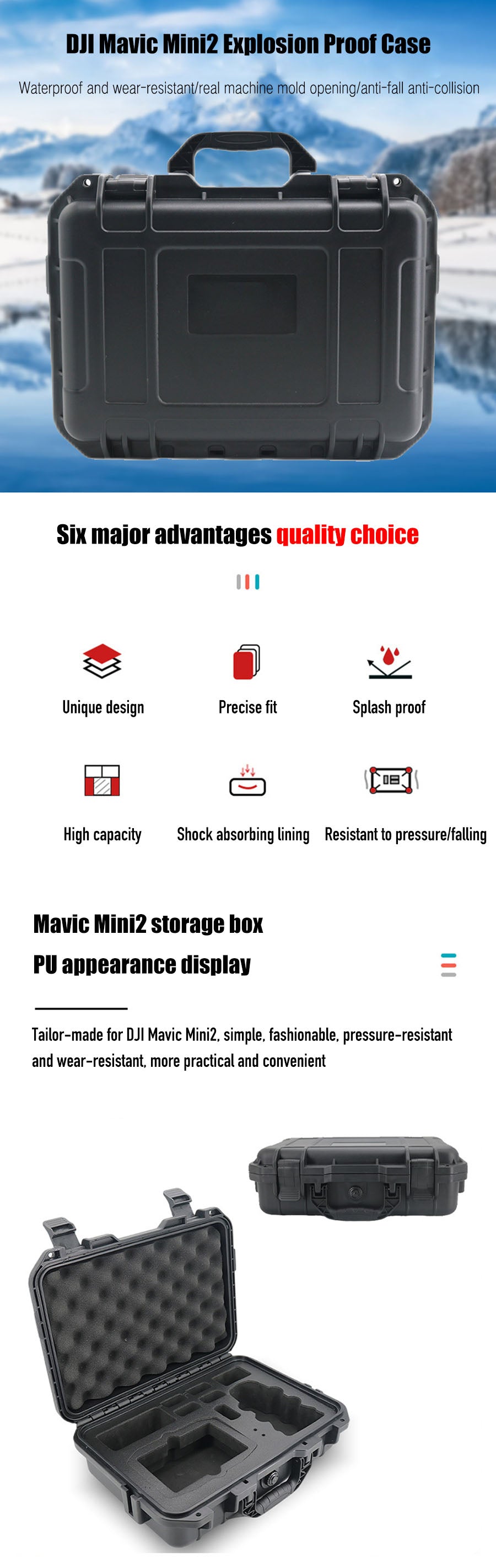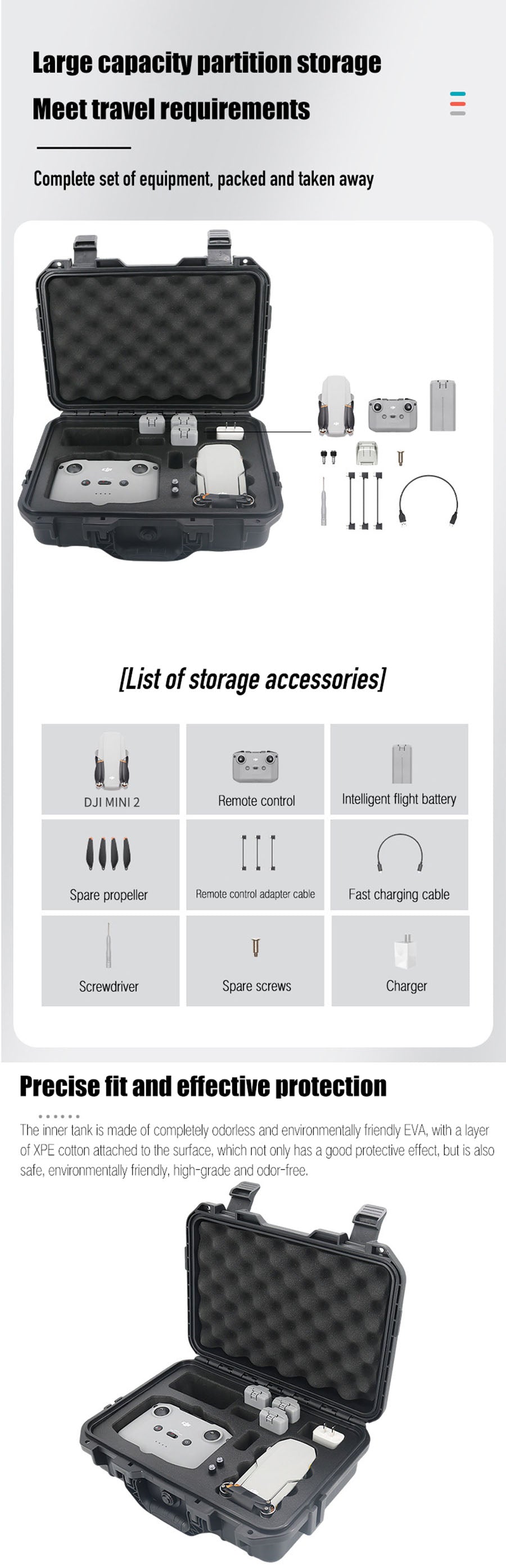 2. Simple design and quality:This DJI Mavic Mini2 storage bag Made of PP engineering materials, the shell is injection-molded with a high-precision mold. The sealing ring at the junction of the upper and lower shells is designed to be anti-fall, anti-pressure, anti-impact, and 1 meter waterproof.