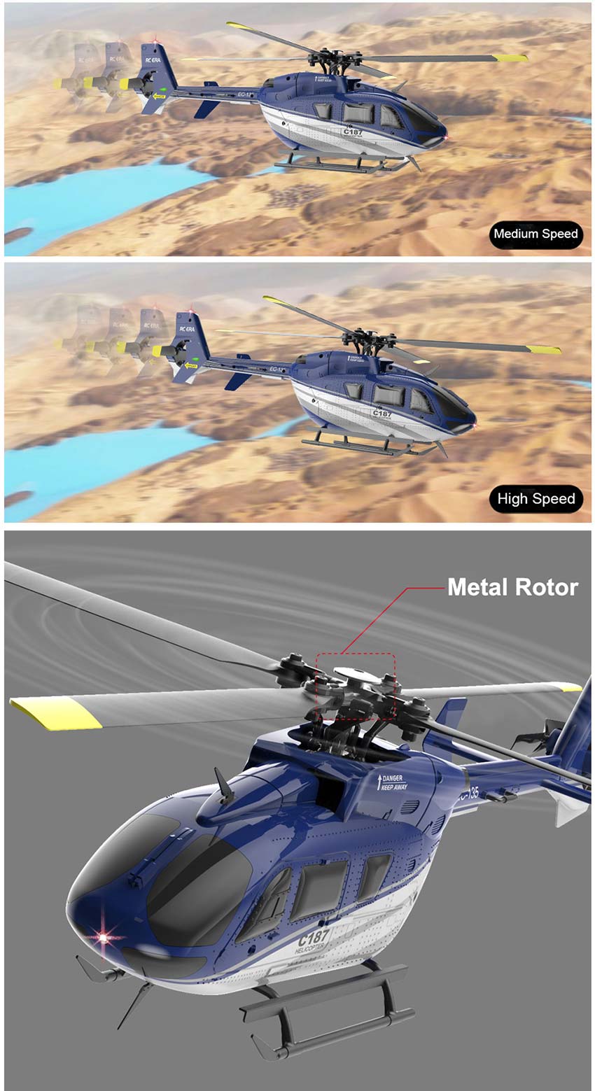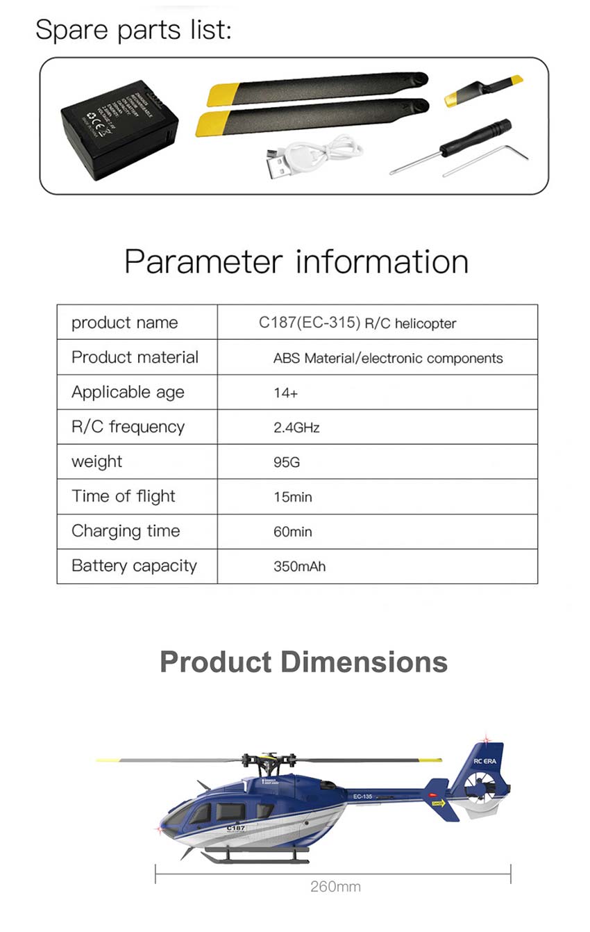 RCERA C187 single propeller is designed without ailerons, the 6-axis electronic gyroscope is used for stabilization, and the barometer is added to fix the height, making the flight more stable and easier to control! Super long battery life! Impact resistant! The shape is scaled down according to the real machine, which can not only control the flight but also be used as a decoration. The RCERA C187 Helicopter battery life can reach about 15 minutes!